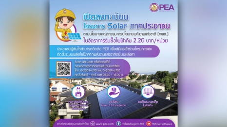 PEA เปิดลงทะเบียนโครงการ Solar ภาคประชาชนตามนโยบายคณะกรรมการนโยบายพลังงานแห่งชาติ (กพช.) ในอัตราการรับซื้อไฟฟ้าคืน 2.20 บาท/หน่วย ประชาชนผู้สนใจสามารถติดต่อ PEA เพื่อสมัครเข้าร่วมโ...